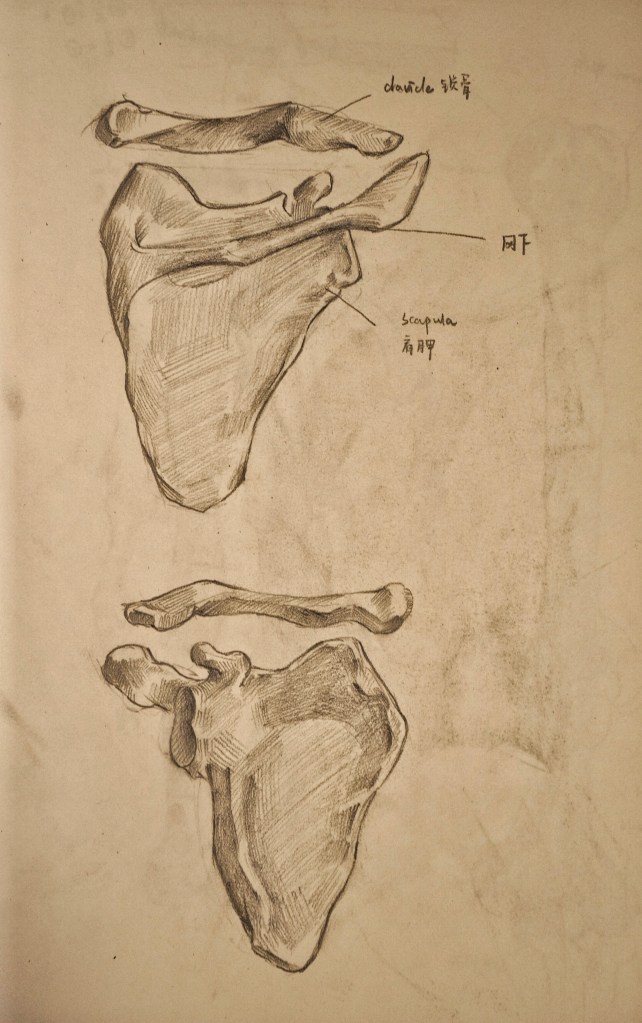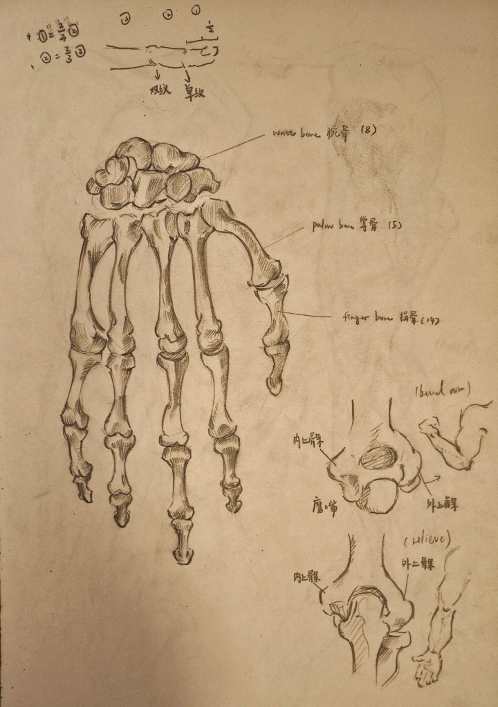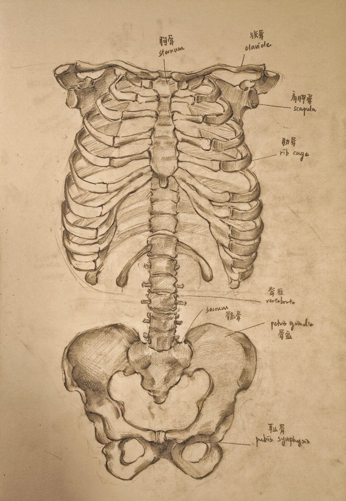 The ratio of sternum is 2/3 of your head, 1/1 of your hand, 1/1 of your clavicle; We have 12 ribs, two of which are shorter than the rest.