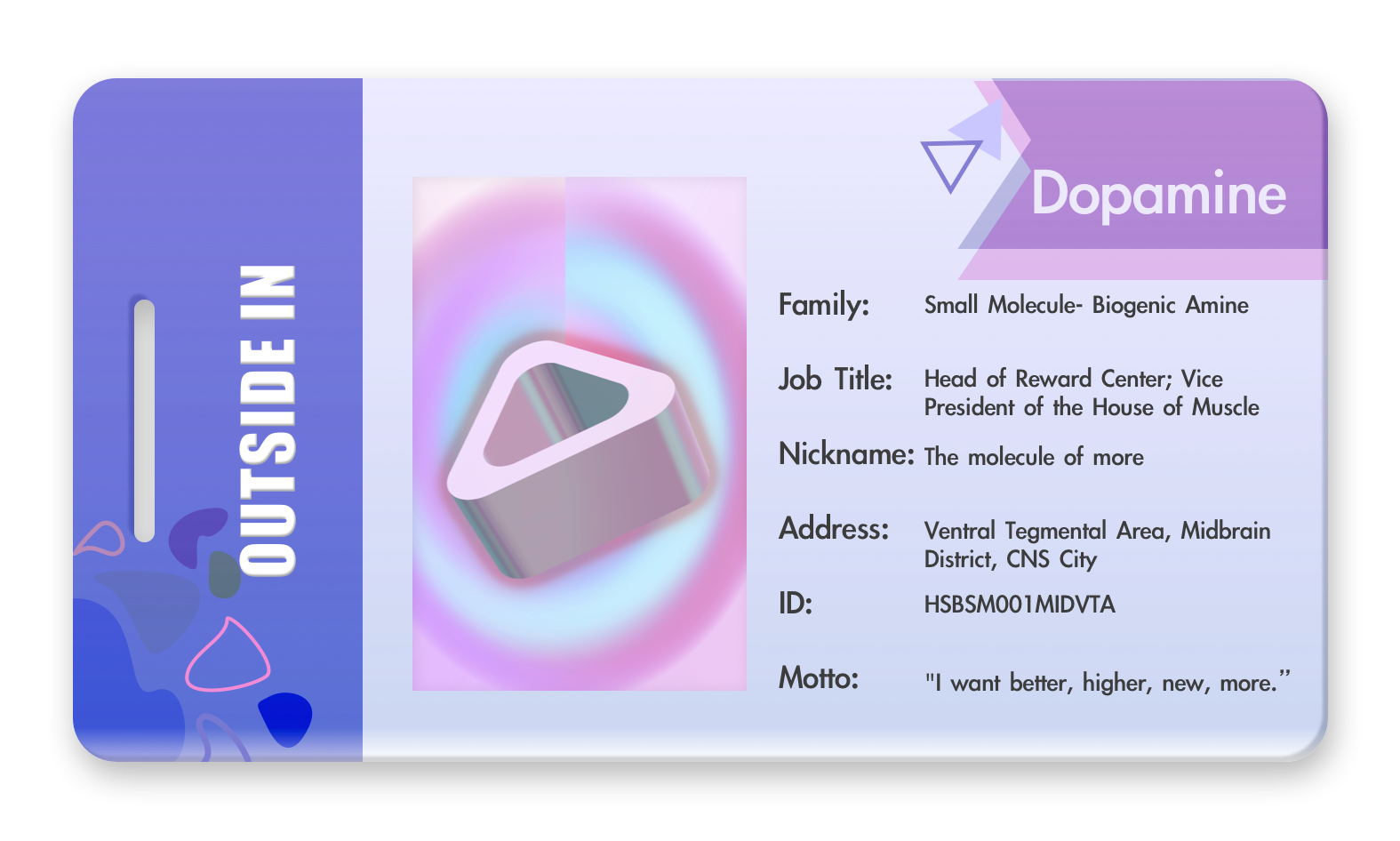 Inspired by the diverse functions of biological neurotransmitters and the animation Inside Out, this project intends to personify seven imaginary characters that walked through my mind while studying neuroscience in biology class. Transforming neurological functions of each molecule into specific superpower and postures, from the reward stimulating effect and executive role of dopamine to the pain-stimulating power of substance P, I depicted each molecule as an individual member of my “brain agent company” according to their unique identities. Whether it is a machine-controlling commander or an empowered spy, bridging scientific background with artistic representations, I hope my “Outside In” brain agents can bring abstract, esoteric scientific concepts to real life using visual language.